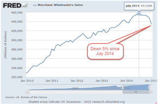 American businesses had hoped that their customers would spend the dollars saved at the gas pump but consumers may be tucking away some of that cash. The slowdown in retail sales may be partly due to the harsh winter in the east, or a lack of income growth. The strong dollar has made American products more expensive to export so businesses are especially dependent on domestic demand. Since last summer, prices at the wholesale level have declined steadily. Commodities other than oil are also showing slack demand.