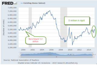 Existing home sales of just over 5 million (annualized) in April were a bit disappointing.   Since the recession, there have been only about six months that sales have been above a healthy benchmark of 5.2 million set in the late 1990s to early 2000s.