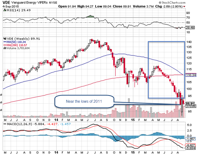 Some sectors of the market can not find a bottom. XME, a blend of mining stocks, is down 45% for the year. Brazil’s index, EWZ, is down a similar amount – about 40%. Emerging Market stocks (VWO) in general have lost about 17% this year, and are at June 2009 prices. After losing 5% of their value in the first week of September, they appeared to have found a bottom, regaining that lost 5% in the next two weeks. This past week they gave up those gains, touching the bottom again. The second time is a charm. If this market draws in buyers a second time, this might be a good time to put some long term money to work.