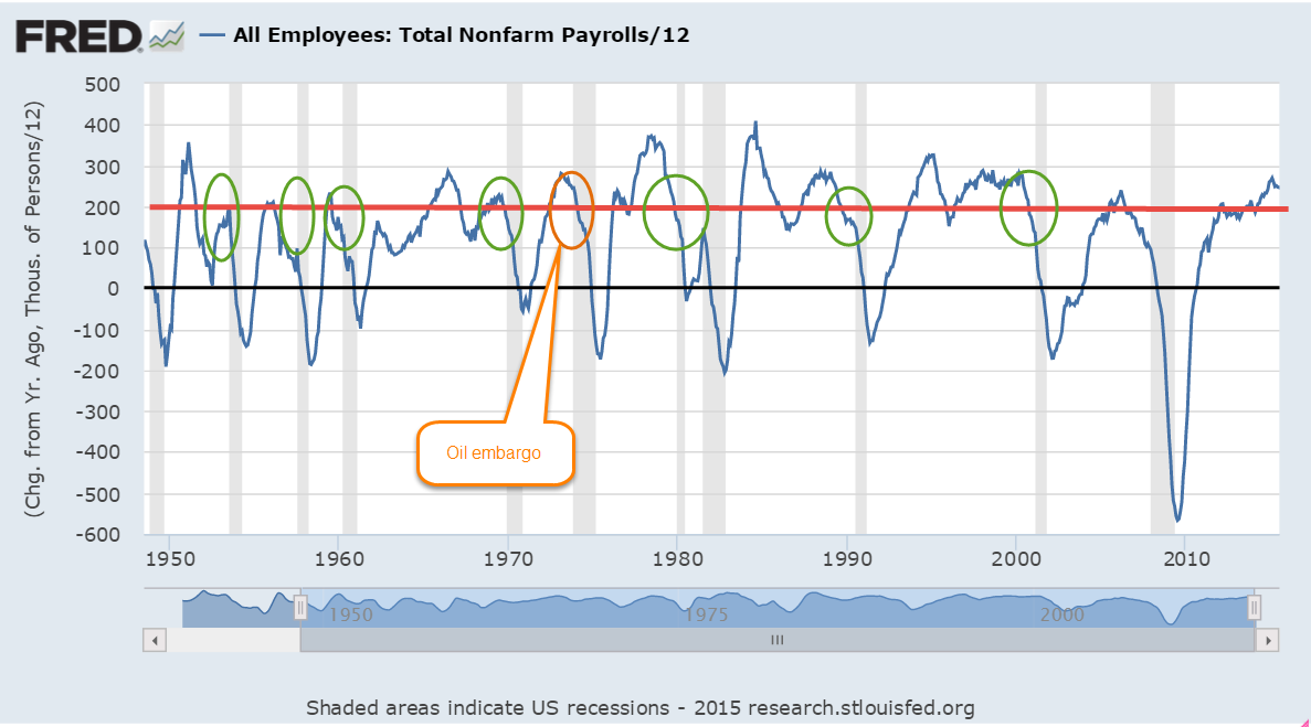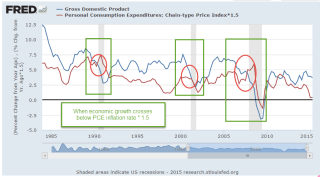 Worries about economic growth in China, in the EuroZone and in emerging markets have prompted fears of a recession in the U.S. It could happen – it will happen – at some point in the future but not in the near future. The Fed likes to use a Personal Consumption chain weighted inflation index called the PCE Price Index which more reliably captures underlying inflation trends. Preceding each recession we see the rate of economic growth fall below the annual growth rate of the PCE index, multiplied by a 1.5 factor. While GDP growth is not robust, it is far above the growth of the PCE price level.