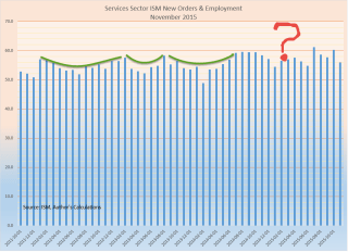However, manufacturing inventories have contracted for five months in a row. For now, this decline is more than offset by inventory growth in the service industries. However, the drag from the manufacturing sector is affecting the services sector. The trough and peak pattern of growth in employment and new orders since the recession recovery in 2009 has begun to get a bit erratic. Nothing to get too concerned about but something to watch.