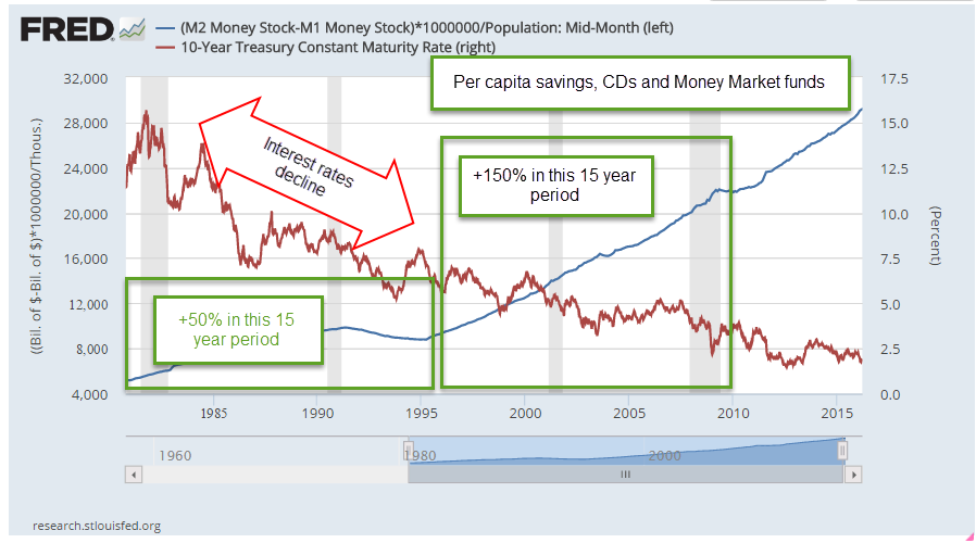 Interest rates are near zero. One year CDs from major banks pay 1% or less. Interest rates have been falling since the early 1980s when savings accounts were earning an astronomical 12% or so. Interest rates are a price of sorts, the price a bank is willing to pay for someone’s savings. Lower interest rates = lower price = less demand for savings. So, people will respond to that lowered demand by putting less money in savings accounts and CDs, right? Wrong.