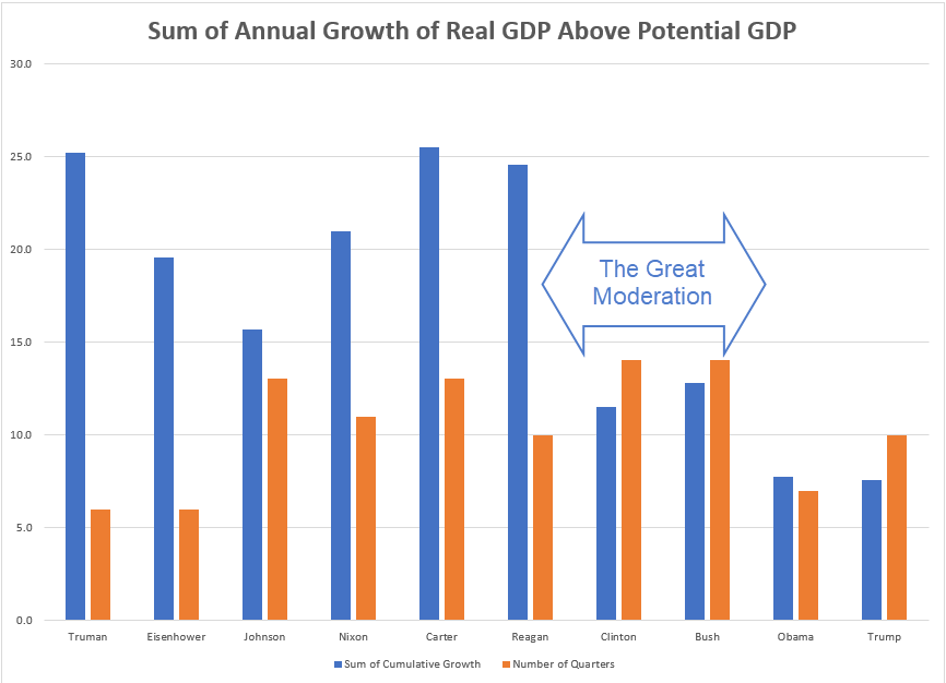 I’ve charted the cumulative growth above potential and the period length for each president.
