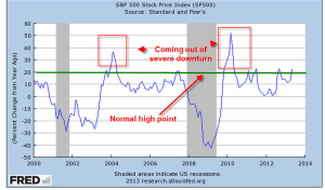 Interest rates can be a heuristic for investors, a signal of the demand for money, a weather vane of the underlying strength of the economy as seen by the top economists in the country, the folks at the Federal Reserve. Low rates could be seen as a cautionary warning to investors. If the economy were really getting stronger, would interest rates remain low? Of course not, an investor might reason. They would rise in response to stronger demand for money. But they are not rising so better to be cautious, the investor reasons. The dog chases its tail.