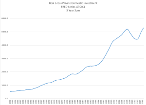 Only this year has the economy surpassed the 2008 level of inflation adjusted private investment. To get a sense of the damage done by the financial and housing crisis, the chart below is a rolling 5 year sum of investment and covers most of the post-WW2 period. Look at the historic dip – not a pause, not a flattening, but a genuine crater in investment growth. Here we can see the over-investment during the tech bubble of the late nineties when the 5 year sum climbed at a 60 degree angle, followed by the 45 degree climb as the housing bubble climaxed. Even scarier is the possibility that we may still be above the growth trend of the 70s, 80s and early 90s – that there is still a bit of correction left.