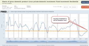 Seven years after the official end of the recession, ten years after the height of the housing bubble, investment in residential housing is still near all time lows. As a percent of the economy (GDP) it has been rising but from a great depth.