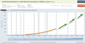 Are low interest rates prompting companies to borrow excessively? Well, yes and no. Yes, they are borrowing more but the growth trajectory, the rate of growth, is about the same as it has been since 1990. As we can see in the chart below, each recession is a pause in the growth of corporate debt. After each recession, the level rises again on approximately the same slope. The “pause” in this last recession lasted a whopping four years, during which corporate debt declined as much as $600 billion, or about 5.6%.