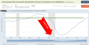Why a dwindling number of rental units? As home ownership rose in the 2000s, the investments in new apartment building began to decline in 2007, then fell abruptly during the crisis. Only in 2011 did it finally start to rise up from its trough. The drop in investment was so huge that just posting a number doesn’t do it justice. Millennials are now being squeezed by a lack of rental housing stock. Sharply rising home values in popular areas like Denver make it more difficult for millennials to shift preferences to home ownership.