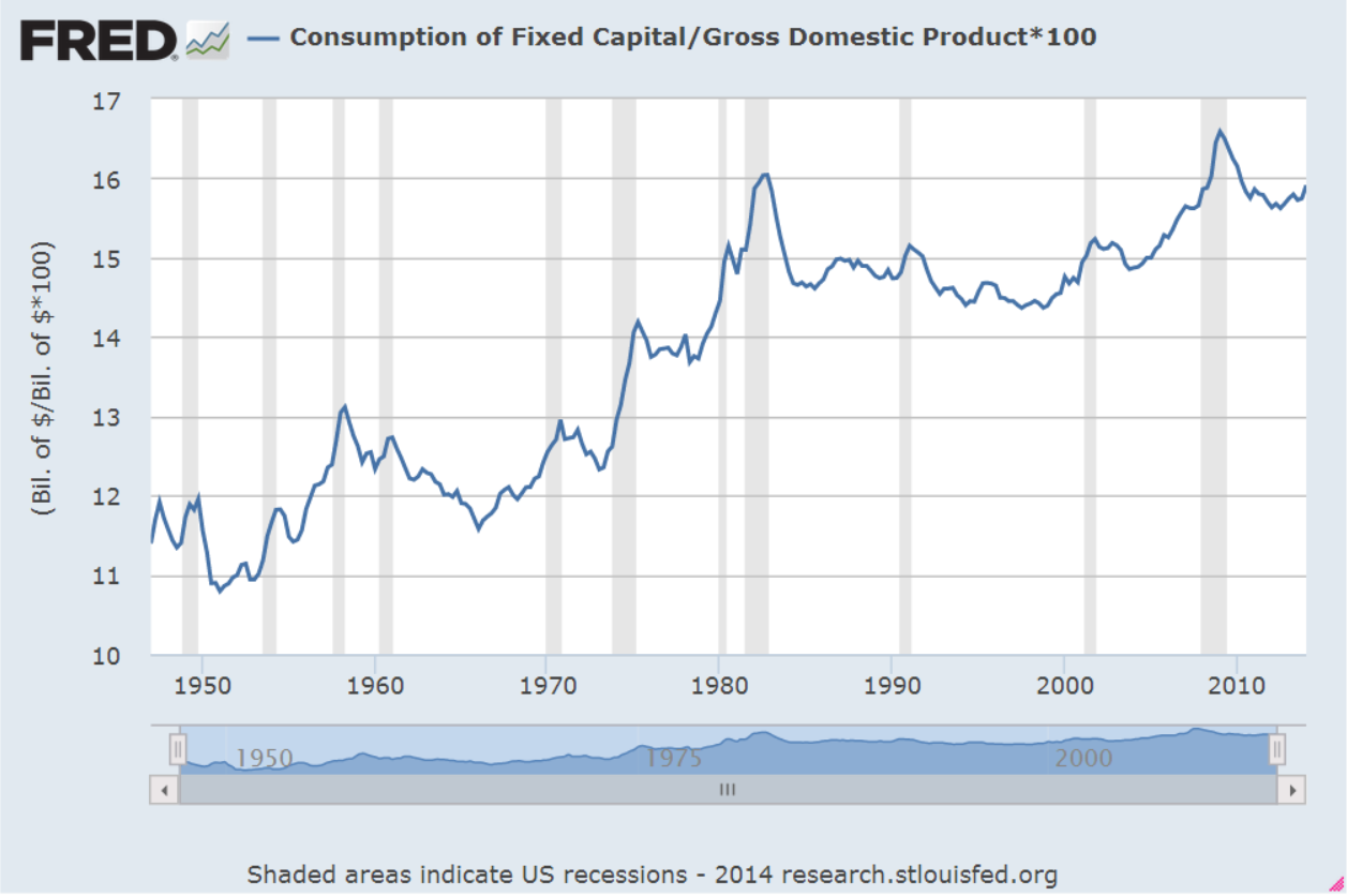 In a low inflation environment, the change in the market prices of equipment and land is muted. Are capital expenditures becoming obsolete at a faster pace? Over the past two decades, software and systems development has become an increasing share of non-residential investment. Rapid changes in technology may be one driver of the acceleration in depreciation. Wikipedia has a good article on the concept as it is reported in the national accounts.