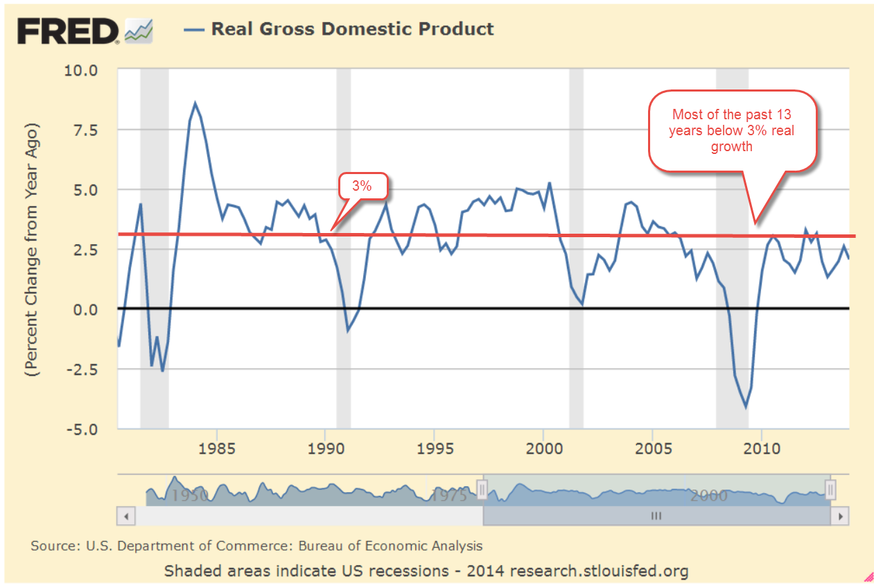 Since 2000, there has been a notable change in economic growth. It is not often that we see growth above 3% as we did in the 20th century.