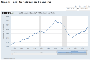 Real construction spending (in 2016 dollars) is currently at a healthy level of $175K per employee, 16% above the low of $151K in the spring of 2011. Although we have declined slightly in the past year, the average is about the same level as late 2006 – 2007 and is above the spending of the 1990s. As a rule of thumb in the construction industry, an employee is going to average 33% in wages and salaries. That doesn’t include the cost of employee benefits, insurance and taxes which will bring the total cost of the employee above 40% of the total cost. So, if spending is $175K, we can guesstimate that the average worker is making about $58K. When I check with the BLS, the average weekly earnings in construction is $1120, or almost $58K. As a side note: that 40% employee cost is used by some contractors as a rule of thumb for a bid total when estimating a job.