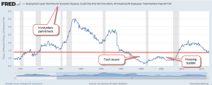 The number of involuntary part-timers has dropped from 2.5 million five years ago to 1.9 million, about 1.3% of workers. This is a lower percentage than the 1970s, the 1980s, and the first half of the 1990s. It is only when the tech boom and housing bubble grew in the late 90s and 2000s that this percentage was lower.