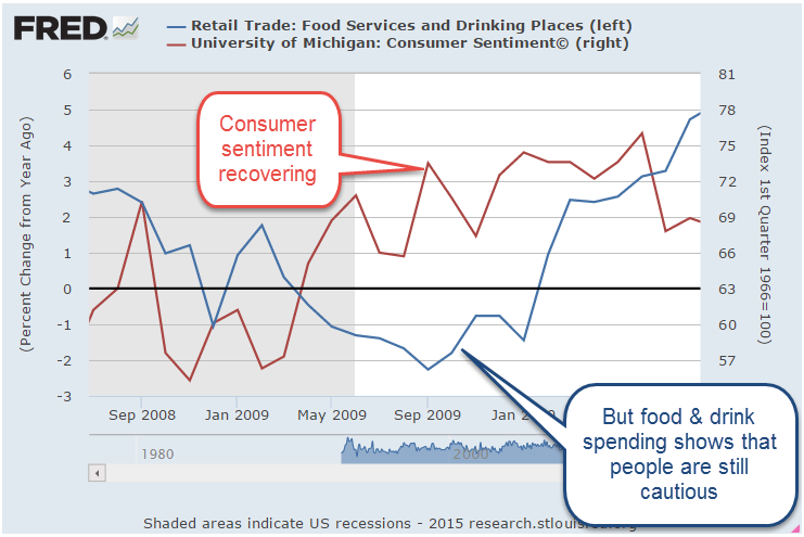 As the economy recovers from a recession, the gap reverses and turns positive; i.e. expectations are higher than current conditions. A person may be out of a job but some of their friends are finding work, so they expect to soon find work. The gap turned positive in 1990 after that recession, again in 2002 and in 2009.
