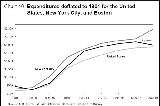 The last page of the report summarizes the century’s changes in discretionary spending: ” households throughout the country have purchased computers, televisions, iPods,DVD players, vacation homes, boats, planes, and recreational vehicles. They have sent their children to summer camps; contributed to retirement and pension funds; attended theatrical and musical performances and sporting events; joined health, country, and yacht clubs; and taken domestic and foreign vacation excursions. These items, which were unknown and undreamt of a century ago, are tangible proof that U.S. households today enjoy a higher standard of living.”