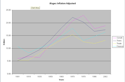 A comparison of a century’s worth of income data shown in Table 27, (PDF) page 56, reveals that there has been dramatic changes in income for the working person. In 1935, the average manufacturing wage was 58 cents an hour, or $7.62 in 2002 dollars. Real manufacturing wages have doubled in 80 years. Real construction wages ($.49 in 1935 = $6.39 in 2002) have tripled in that same time. In the finance and insurance industry, wages have seen the smallest increase in real terms but even those have swelled by 60%. However, after adjusting the wage data in Table 27 for inflation reveals that real wages have decreased in the past 30 years. The boom happened a long time ago.