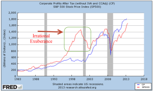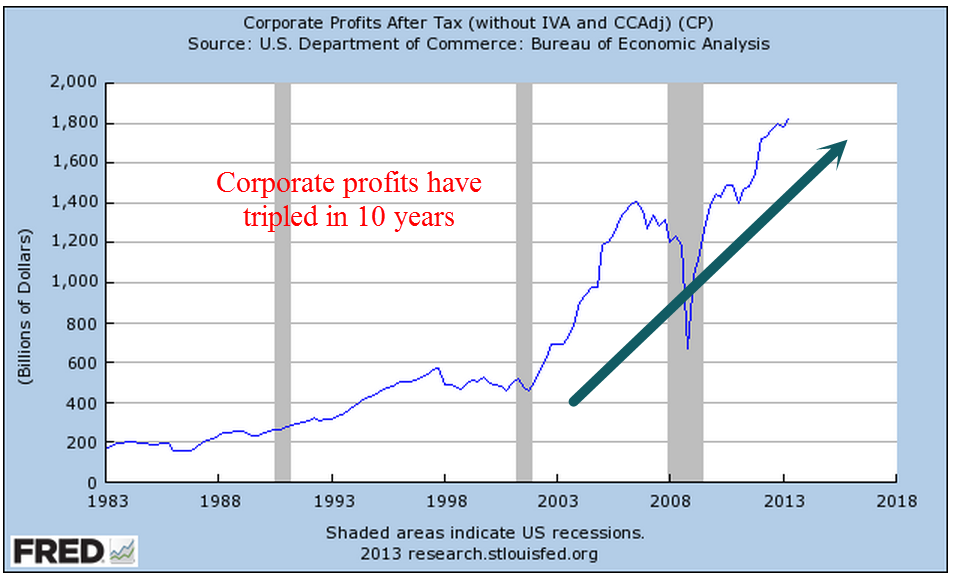 Let’s look at two series over the past sixty years – personal savings and corporate profits. If we think of a household as a small enterprise, personal savings is the residual left over from the household’s labor. Likewise, corporate profits are the residual left over from current production. In 1994, the two series diverged. Corporate profits (the blue line in the graph below) kept rising while personal savings plateaued for a decade. Each series is a percent of GDP to demonstrate the trend more easily.