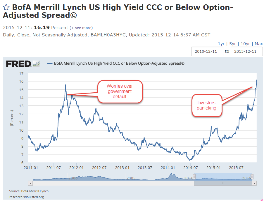 Several weeks ago, I noted the growing “spread” between Treasury bonds and high yield junk bonds. The graph I showed was the benchmark of junk bonds, the Master II class. Let’s call them Bench Junks. The bottom of the barrel, so to speak, are those company bonds rated CCC and lower. These are companies that are more likely to default as economic growth slows or contracts. Let’s call them Low Junks. While the Bench Junks’ spread shows investor concern, the Low Junks’ spread shows a stampede out of these riskier bonds. A rising spread means that the prices for those bonds are falling, effectively giving buyers a higher interest rate. Investors want the higher yield to compensate them for the higher risk of owning the bonds.