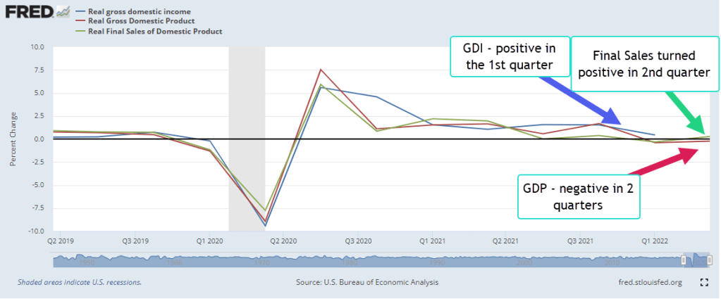 The two measures capture different aspects of a country’s economy. The graph below charts the quarterly growth in real, or inflation-adjusted GDP and GDI (BEA, 2022). Notice that GDI quarterly growth remained positive in the 1st quarter. The Bureau of Economic Analysis (BEA, 2021) won’t release 2nd quarter data for Gross Domestic Income for another month. A third measure, Final Sales of Domestic Product, excludes inventory adjustments and it turned positive in the second quarter.