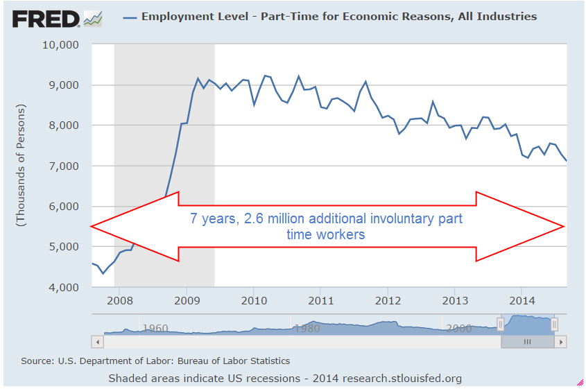 2.6 million more people were working part time because they could not find full time work. The number of underemployed had grown almost twice the 1.4 million new jobs created in seven years.