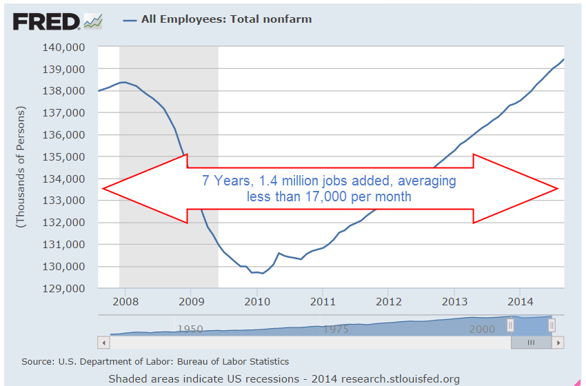 When they returned to their hotel room later that night, a stiff wind blew off the ocean, bringing with it a bit more chill than either of them had packed for on this trip. George checked the monthly employment data released that morning by the BLS. Job gains had surprised to the upside at almost 250K but the market had still closed below Wednesday’s opening price and was still below the 10-day average. He pulled up some FRED data to get a snapshot of the relative health of the labor force seven years after the start of the recession. The results were rather chilling – or maybe it was the dampness of the Oregon coast that he was unaccustomed to. In seven years the number of employed people had grown just 1% – not 1% annually but 1% total for the entire time.