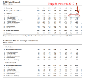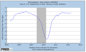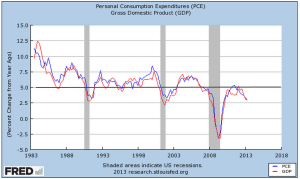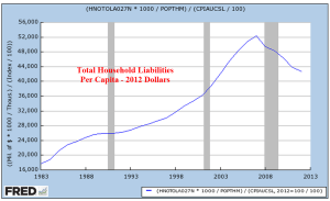 From 1994-2007, the public debt (GFDEBTN) grew 5% per year while household debt rose 8.7% annually. As a percent of disposable income, household debt jumped from 78% at the end of 1994 to 124% at the end of 2007. Chiefly responsible was the doubling of mortgage debt (HHMSDODNS) during the first seven years of the 2000s. Lax underwriting standards allowed families with poor credit scores of less than 620 to secure mortgages. Millions lost their homes during the housing bust, banks tightened lending standards and Americans were forced to go on a credit diet.