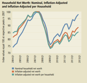 In contrast to the growth of the public debt, the growth in household debt has decreased since the financial crisis and the housing bust. The chart below compares the two types of debt, public and household, in two 13 year periods before and after the financial crisis.