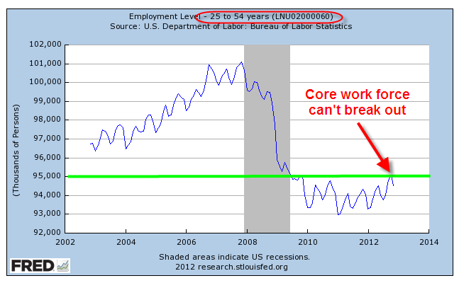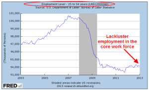Economists at the Bureau of Labor Statistics (BLS) refer to workers aged 25 -54 as the core work force. To save some typing, I will refer to this age demographic as the “core.” During those thirty years we accumulate stuff while we build our careers. We buy cars, furniture, homes and vacations. We build retirement savings for ourselves and college funds for our kids. The core is the nexus of a growing economy.