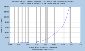 Visitors to an air show may have had the opportunity to witness the vertical take off power of an F18 fighter jet.  Flying horizontally to the ground, the jet makes an almost 90° turn and shoots up into the sky, a breathtaking show of power for spectators.  Welcome to the airshow of the last three decades.  Below is a Federal Reserve graph of household debt. (Click on any graph to enlarge)