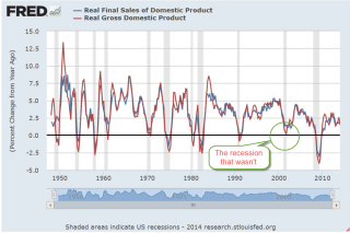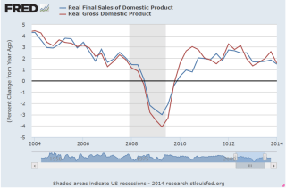 Contributing to the quarterly drop was the 1.7% decline in inventories.  Businesses had built up inventories a bit much in the latter half of 2013 in anticipation of sales growth only to see those expectations dashed by the severe winter weather.  Final Sales of Domestic Product is a way of calculating current GDP growth and does not include changes in inventory.  Let’s look at a graph of the annual growth in Real (Inflation-Adjusted) GDP and Real Final Sales of Domestic Product to see the differences in the two series.