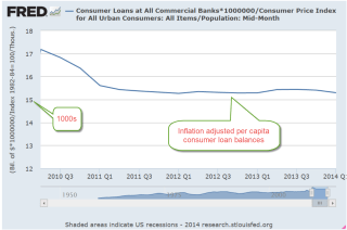 About two years ago, loan balances stopped declining and since then consumers have added $80 billion, much of it to finance car purchases. $25 billion of that $80 billion increase has come only since the beginning of this year.  On a per capita, inflation adjusted basis, consumer loan balances are still rather flat.