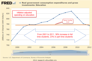Let’s then go back to what was presumably a good year, 2000, the height of the dot-com boom.  State coffers were full.  In 2000, state and local governments spent 5.14% of GDP (Source).  By 2010, that share had grown to 5.82% of GDP (Source). That represents a 13% gain in resources devoted to education.  But that is barely above population growth, without accounting for the rush of enrollment in higher education during the decade.