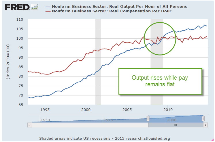 The Bee Gees might have sung “Words are all I have to take your heart away” because they were singing about love, not economics and finance.  Graphs often tell the story much better than words.  A milestone was passed a few years back.  For the first time since World War 2, the growth in income crossed below the growth in output.