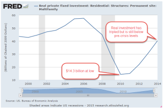 The larger publicly traded homebuilders also build multi-family units.  Real investment in this sector has tripled from the lows of early 2010 but are still below pre-crisis levels.