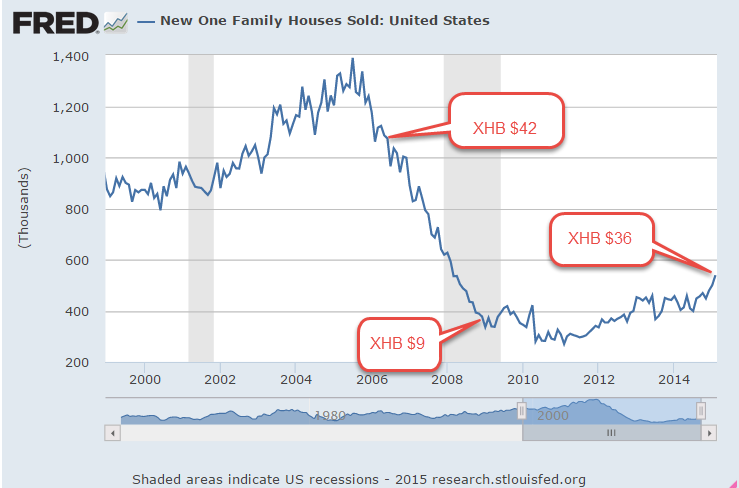 Sales of new homes and the fortunes of home builders are based on the churn of existing homes.  Since October, the stocks of home builders (XHB) have climbed 20% in anticipation of growing sales, but weak existing home sales may prove to be a choke point for growth.