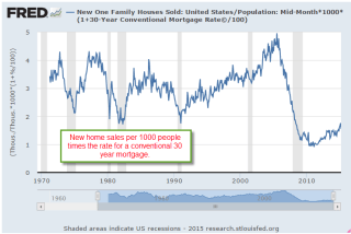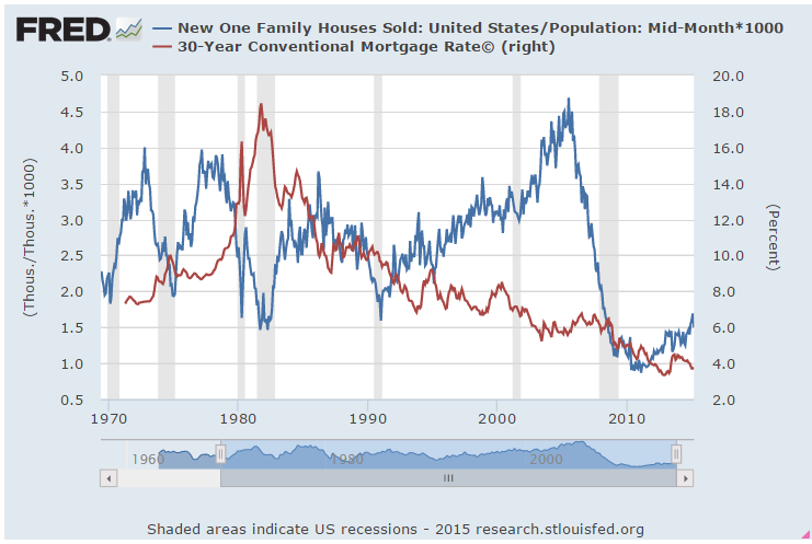 Last week I showed a chart of new home sales per 1000 people.  I’ll overlay the thirty year mortgage rate over it.