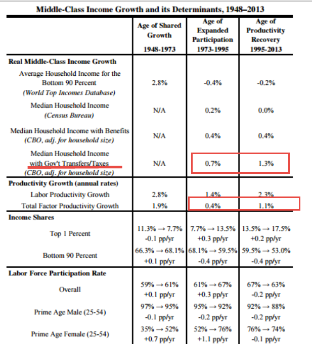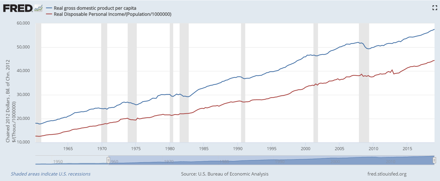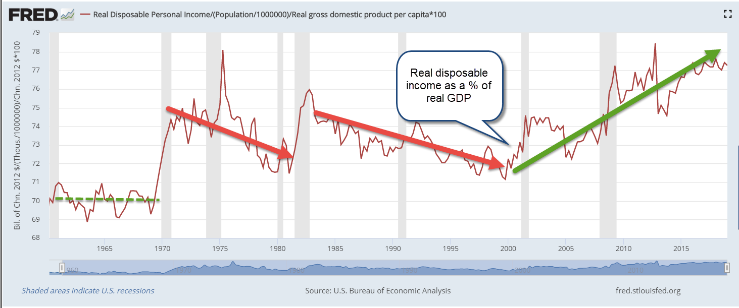 The BLS calculates a Total Factor Productivity that includes capital and labor. A 2018 study by the BLS calculated 2.9% annual output growth since the late 1980s. Estimating the sources of growth, they found that capital had contributed 40% more to productivity than labor but, even so, labor’s share of the gains should be at least 1% annually. If so, the MHI would be considerably higher today.