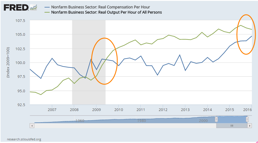 FRED Employee Cost Index – Total Compensation: ECIALLCIV, adjusted for inflation using PCEPI.