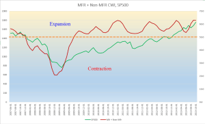 Lastly, I will include the contribution of health care, education and social services, which contribute 7.5% to GDP but employ almost a quarter of all workers. Since the financial crisis and the passage of Obamacare, this composite sector contributes an additional 1% to GDP. These sectors include many public goods and services that form the backbone of our society. The 3.0 ratio is the inverse of the mining sector.