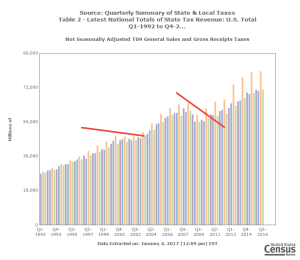 Of particular note in the graph above is the steep 10% drop in sales tax collections in the second quarter of 2009. Fom a vantage point eight years in the future, we may have forgotten the degree of fear during the winter of 2008-2009.  The American people were holding onto their money.  State budgets were crippled by the lack of sales tax collections, an important and ongoing source of revenue for state and local governments.