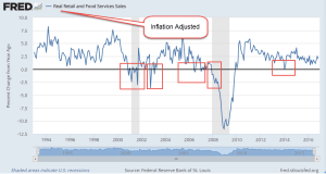 Side note on Sales Tax.  The Federal Reserve charts retail sales but these are based on data samples and will not be as accurate as the actual tax collected.  When retail sales are adjusted for inflation, the year over year growth can give a number of false positives.  In the graph below, I have marked up periods that went negative without the economy going into recession.  I think that the actual tax collected may be a much more accurate predictor of economic weakness.