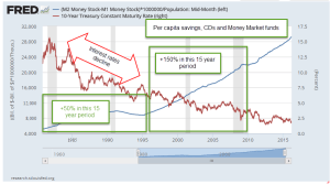 So we would expect that “safe money” savings would increase somewhat in the past decade. However, the difference in the amount of savings is dramatically higher. In the 15 year period from 1980 to 1995, Money Market, savings accounts, and CDs grew by 50% per person. In the subsequent 15 year period from 1995 to 2010, safe savings grew by 150%, triple the increase of the previous fifteen year period.