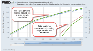 A few weeks ago (here) I wrote about trends in income growth and the difficulties of measurement because the growth of employee benefits and insurances are not included. As a follow up, I thought I would show you a chart of per capita income using a natural log scale, which shows a growth trend more clearly. In the graph below, we can see three distinct periods of growth: