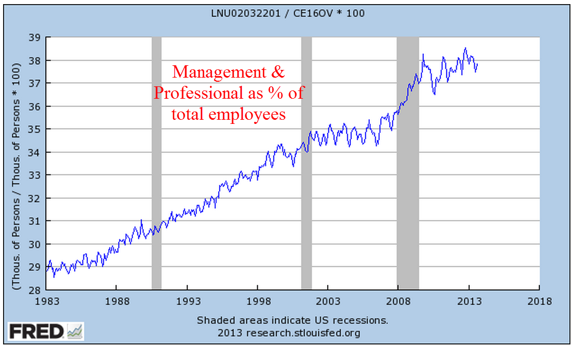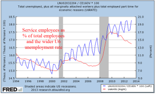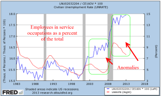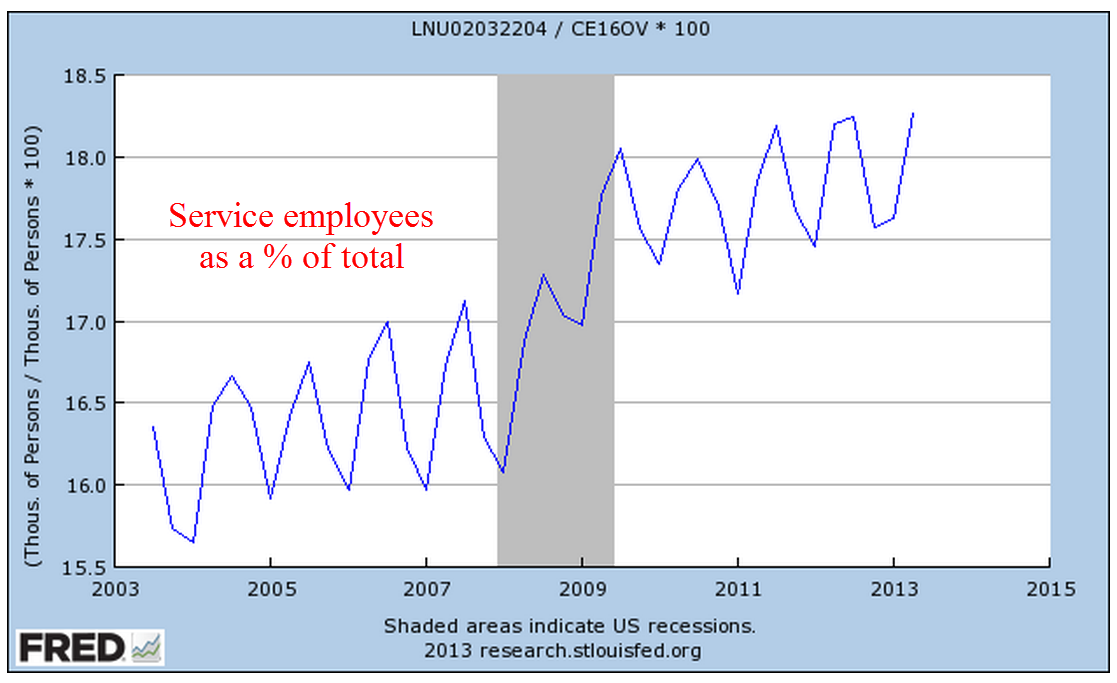 Employment in service occupations makes up almost 20% of the work force and usually peaks in July of each year after a January trough. The numbers come from the monthly survey of business payrolls so it affects the job gains number to some degree, depending on the seasonal adjustments. I expected this month’s report to show the normal pattern, rising up at least 50,000 from June’s total of 26.54 million. I was surprised to see that employment in this composite had dropped by 170,000 in July.