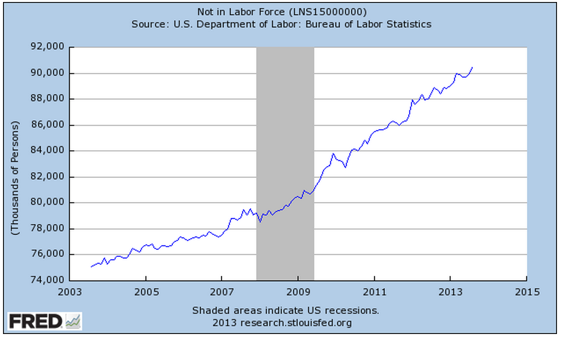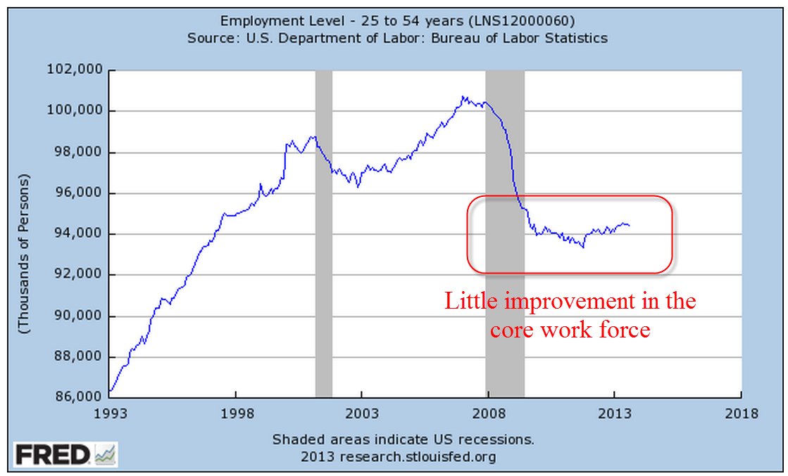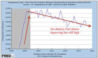 Employment numbers can hide weaknesses in the labor market. After falling to a low of 7.2 million this February, people working part time because they can’t find full time work has climbed up 300,000 to 7.5 million. The good news is that the ranks of involuntary part-timers has dropped by 700,000, or 8.5%, from July 2013 to this July.