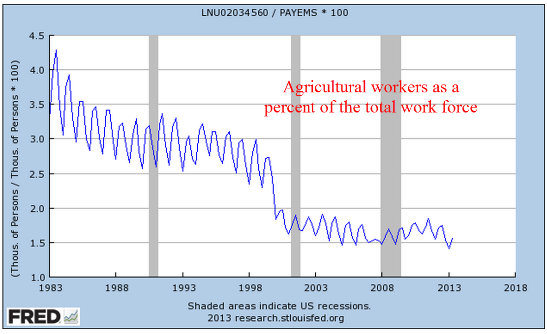 Let’s put this early estimate in perspective. The year-over-year percent growth is 2.4%, above the 1.6% average y-o-y growth of the past ten years. Let’s get out our magic wand and take away the recessionary four quarters in 2008 and two quarters in 2009. Let’s add some good numbers in late 2003 and early 2004 as the economy recovered from the dot com boom period. Presto chango! Well, not so presto. We see that the average over these 37 quarters, just a bit more than 9 years, is still only 2.3%.
