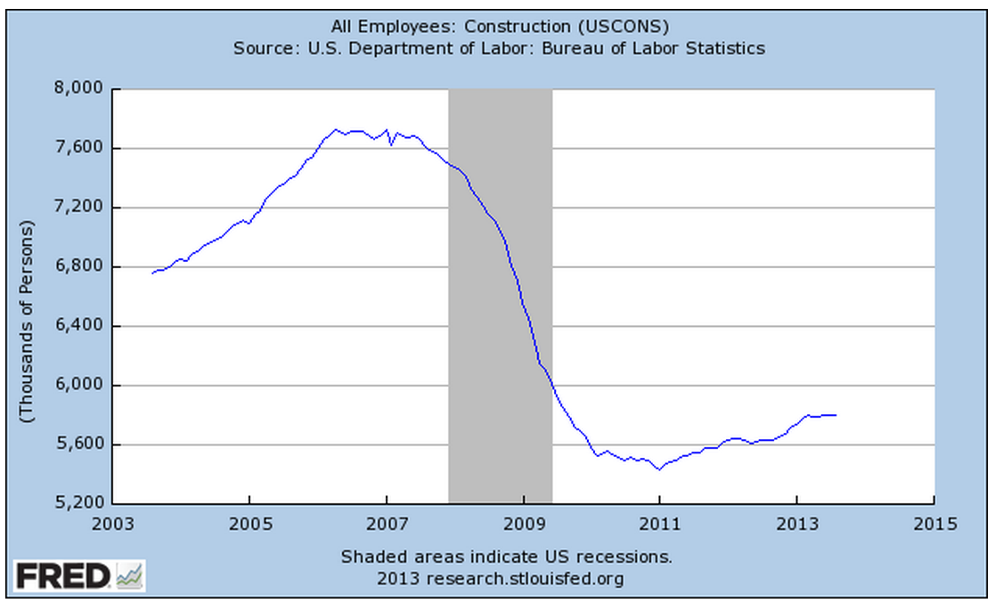 Construction added 20,000 jobs in July, and are up 3.6% above July of 2013. Total Construction spending includes residential and commercial buildings, public infrastructure and transportation. Spending in June declined almost 2% from a strong May but is up more than 5% from last year. A casual glance at the spending numbers might lead one to observe that, after the housing boom and bust, the construction sector is on the mend.