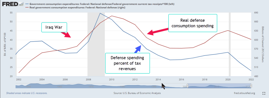 U.S. Bureau of Economic Analysis, Real government consumption expenditures: Federal: National defense [A997RX1A020NBEA], retrieved from FRED, Federal Reserve Bank of St. Louis; https://fred.stlouisfed.org/series/A997RX1A020NBEA, May 18, 2023.