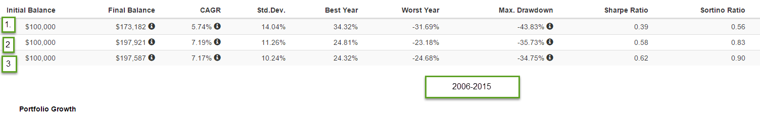 To see the effects of a balanced allocation, let’s look at a particularly ugly period in the market, the period from 2000 through 2011. The stock market went through two downturns. From 2000-2003, the SP500 lost 43% (using monthly prices). The decline from October 2007 to March 2009 was a nasty 53%. In 2011 alone, a budget battle between the Obama White House and a Republican Congress prompted a sharp 20% fall in prices. During those 12 years, the SP500 index lost about 10%, excluding dividends.