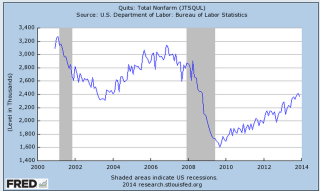 On page five of this paper, Mr. Fujita presents what is called a “labor-matching” model that attempts to explain changes in unemployment and wages, primarily from the employer’s point of view. Central elements of this model, familiar to many business owners, include uncertainty of future demand and the costs of finding and training a new worker. Mr. Fujita examines an aspect that is not included in this model – the degree of uncertainty that the worker, not the employer, faces. In the JOLTS report, the BLS attempts to measure the number of employees who voluntarily leave their jobs. These Quits indicate the confidence among workers in finding another job. The JOLTS report released this week shows an increasing level of confidence but one which has only recently surpassed the lows of the recession in the early 2000s.