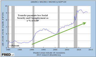 In this election year, as in 2012, the subject of transfer payments will rear its ugly head with greater frequency. In the mouths and minds of some politicians, “transfer payments” is synonymous with “welfare.” Don’t be confused – it is not. As this aspect of the economy grows, politicians in Washington and the states get an increasing say in who wins and who loses. Below is a graph of transfer payments as a percent of the economy. I have excluded Social Security and Unemployment because both of those programs have specific taxes that are supposed to fund the programs.